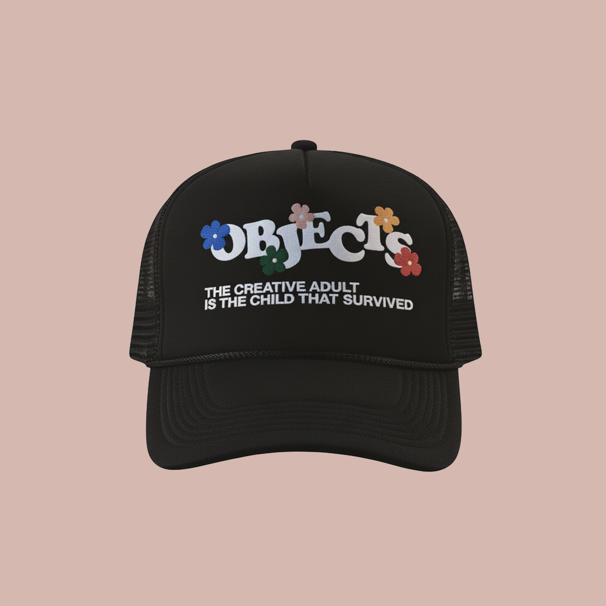 A reminder you can wear every day. The Inner Child trucker keeps the Objects logo and The creative adult is the child that survived message right on your forehead so you remember to stay playful and gentle with yourself.